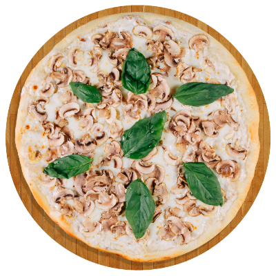Шампиньоны, свежая зелень, твёрдый сыр, соус оливковый, специи, основа для пиццы