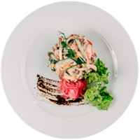Тигровая креветка, авокадо, черри, моцарелла, лист салата, соус винегрет, соус песто