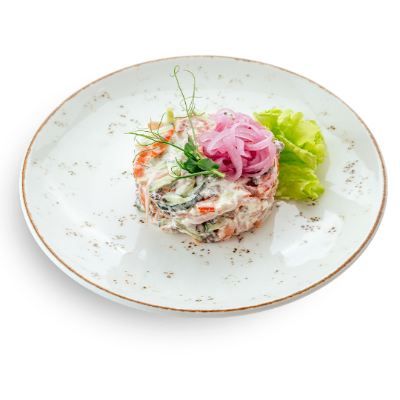 Говяжья вырезка, ветчина, помидоры, огурцы, лук маринованный, майонез, зелень