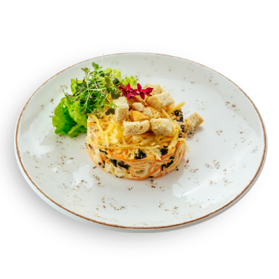 Морковь пряная, филе куриное, чернослив, гренки белые, сыр, майонез, зелень